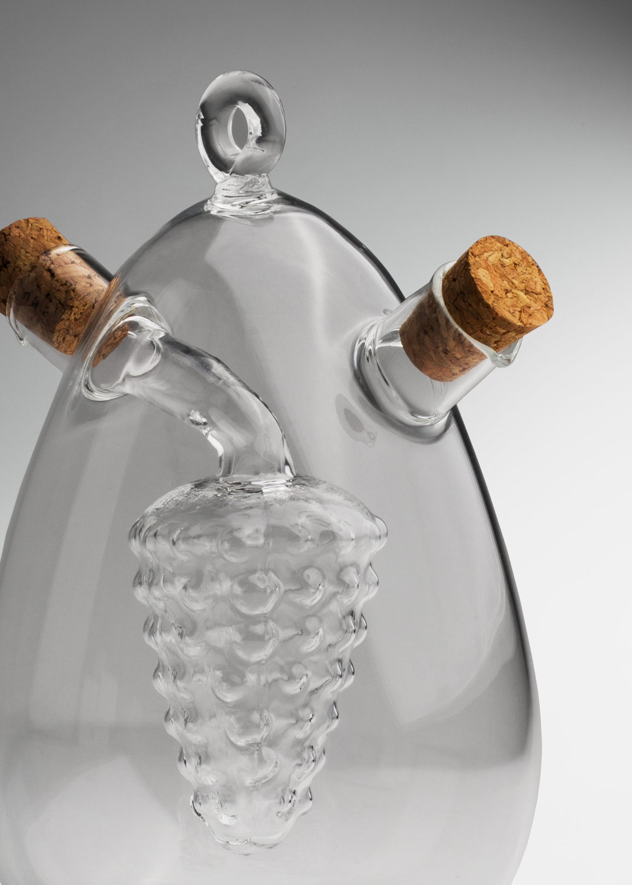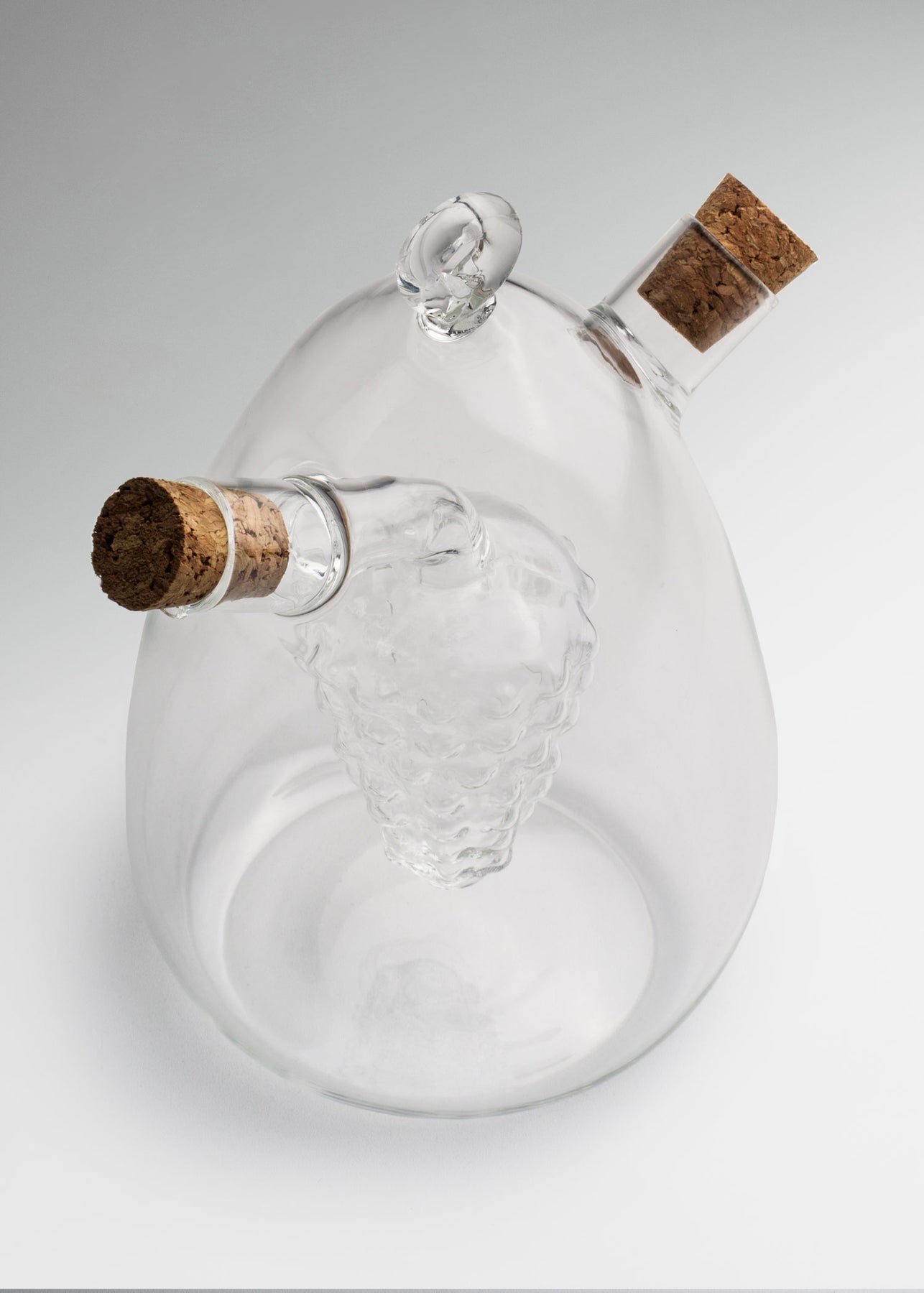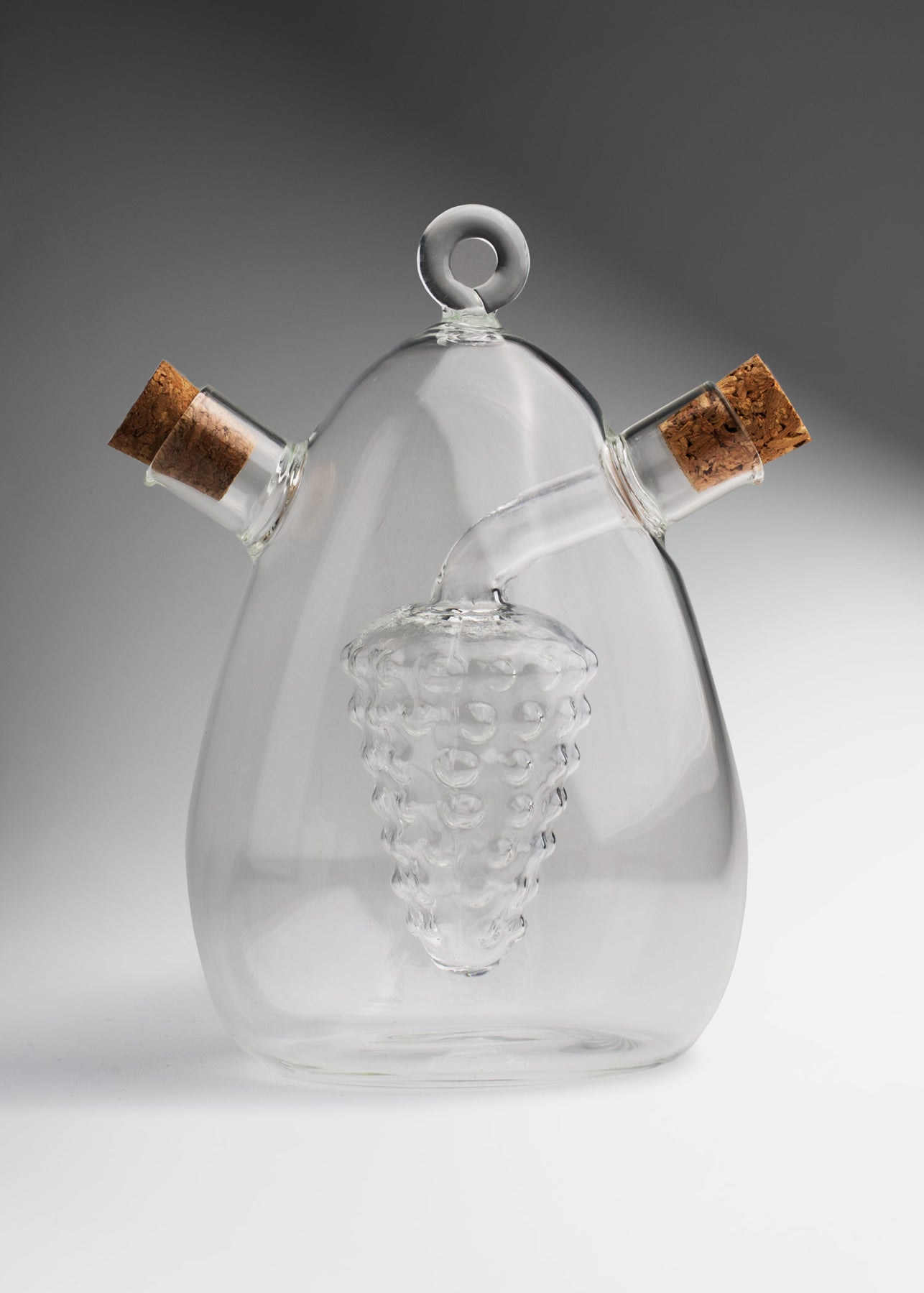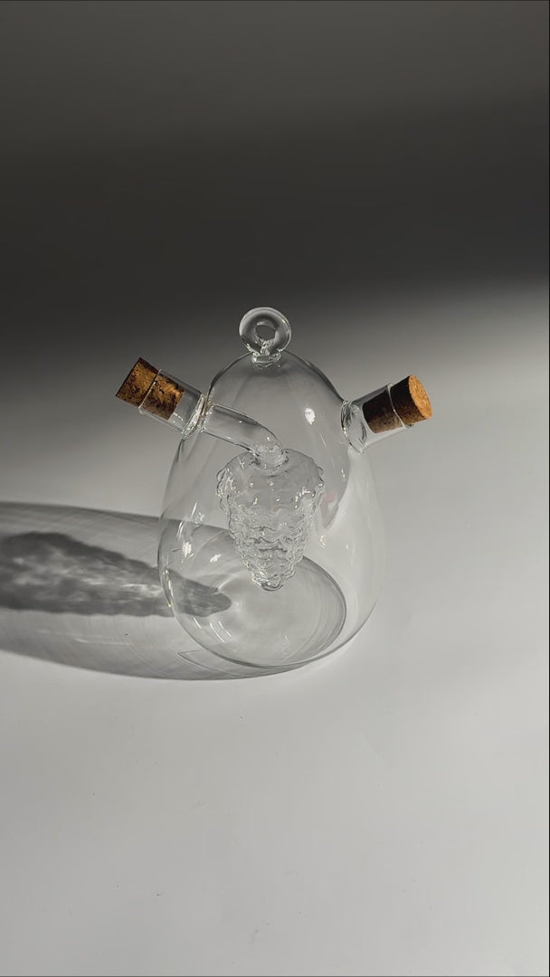La vinagrera con corcho de 15.5 cm destaca por su diseño artístico y funcional, elaborada en vidrio de borosilicato transparente de alta resistencia. Su forma elegante con detalle interno en forma de racimo de uvas la convierte en una pieza decorativa y práctica para servir aceite y vinagre de manera original.