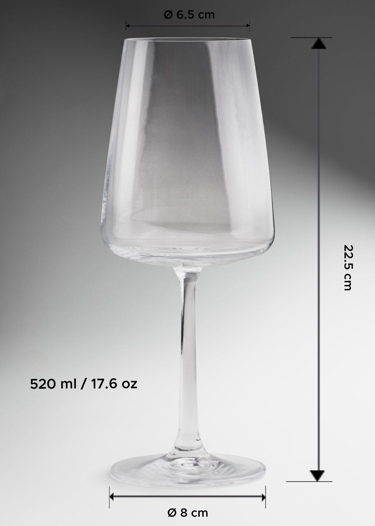 La copa de vidrio de 520 ml destaca por su diseño esbelto y elegante, perfecto para realzar los matices y aromas del vino tinto. Su silueta alargada y base firme ofrecen equilibrio y estilo, convirtiéndola en una pieza imprescindible para quienes disfrutan del arte de servir vino con sofisticación.