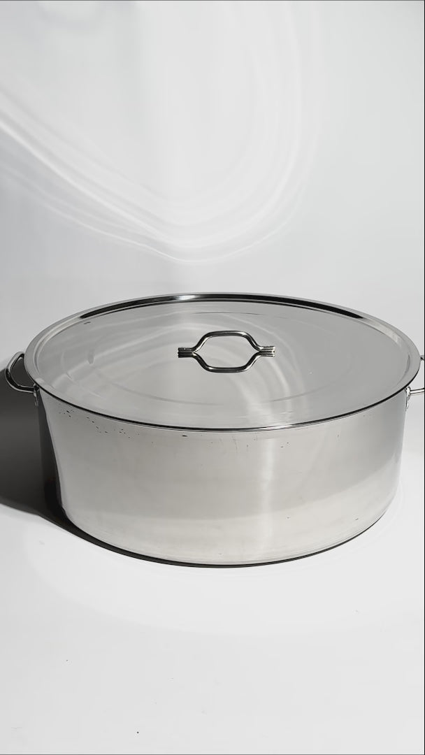La budinera con tapa de 57 litros es el equipo que necesitas cuando se trata de cocinar a gran escala. Gracias a su fabricación en acero inoxidable 201, ofrece una excelente durabilidad y resistencia al uso intensivo en cocinas profesionales. Esta budinera con tapa incluye agarraderas del mismo material con remaches reforzados que garantizan un agarre firme y seguro incluso al moverla con contenido caliente.