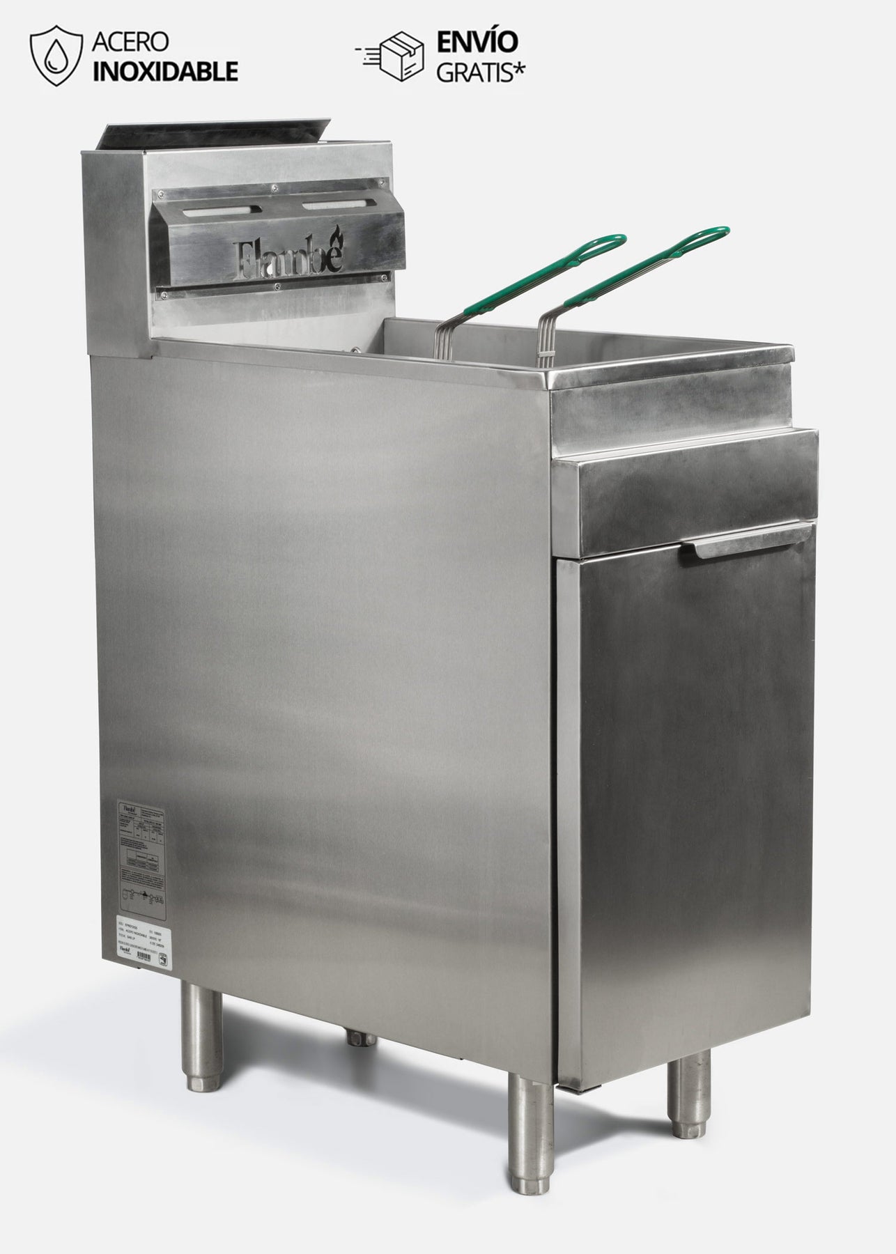 Cuenta con un termostato de seguridad a 450 °F, patas niveladoras con extensión hasta 8” para una perfecta instalación y un tubo de drenaje de aceite con extensión que facilita el vaciado y mantenimiento. La capacidad de su tina de 20 litros permite freír grandes cantidades de alimentos de manera eficiente, mientras que el juego de canastillas de alambrón con mangos plastificados brinda seguridad y comodidad en cada uso.